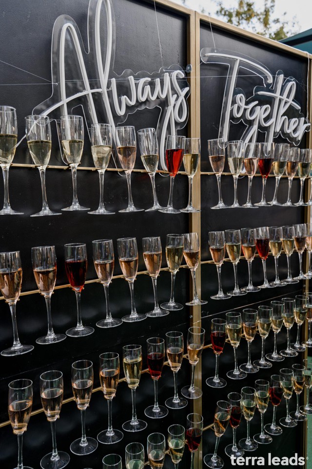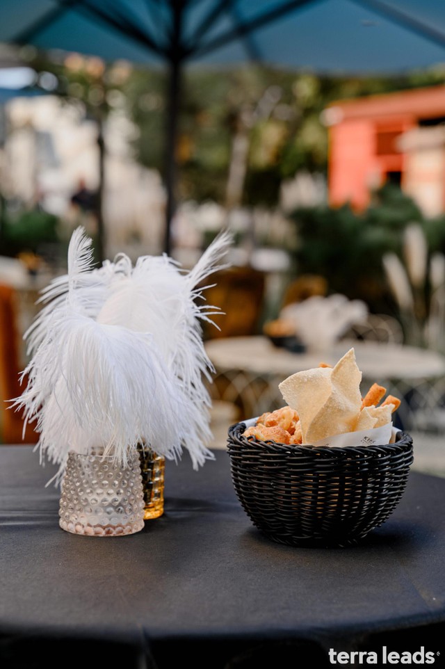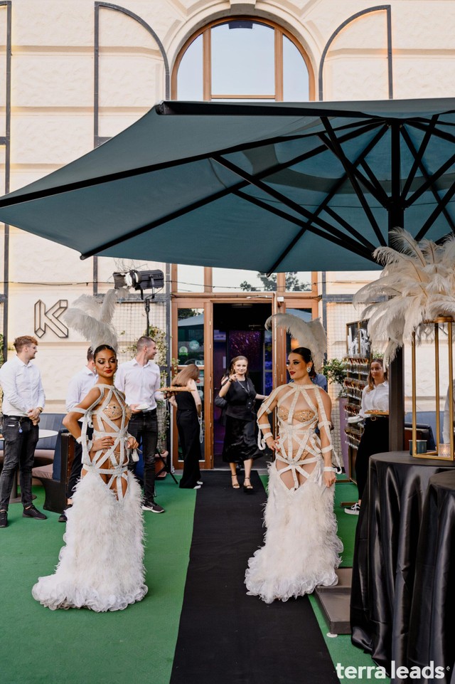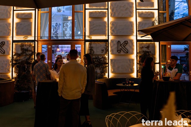 Начало мероприятия и встреча гостей. Люди задерживались для фото на велком-зоне, но большинство сразу прошло на террасу. Там всех ждали закуски и вино — мы постарались 🍷 Кто-то из гостей еще был на подходе.